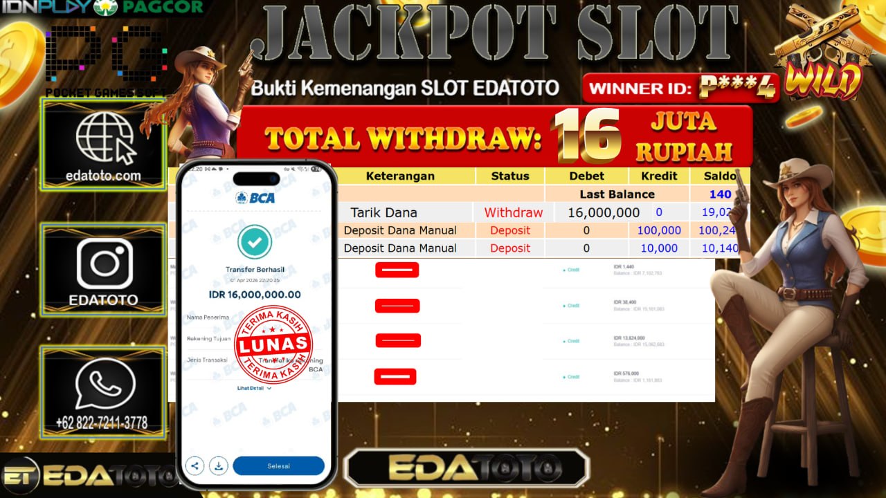 Selamat Kepada Pemilik user ID : P***4 Hari/Tanggal : Rabu / 01 APRIL 2026 Jackpot : Rp,  12,000,000 JT Withdraw . . .