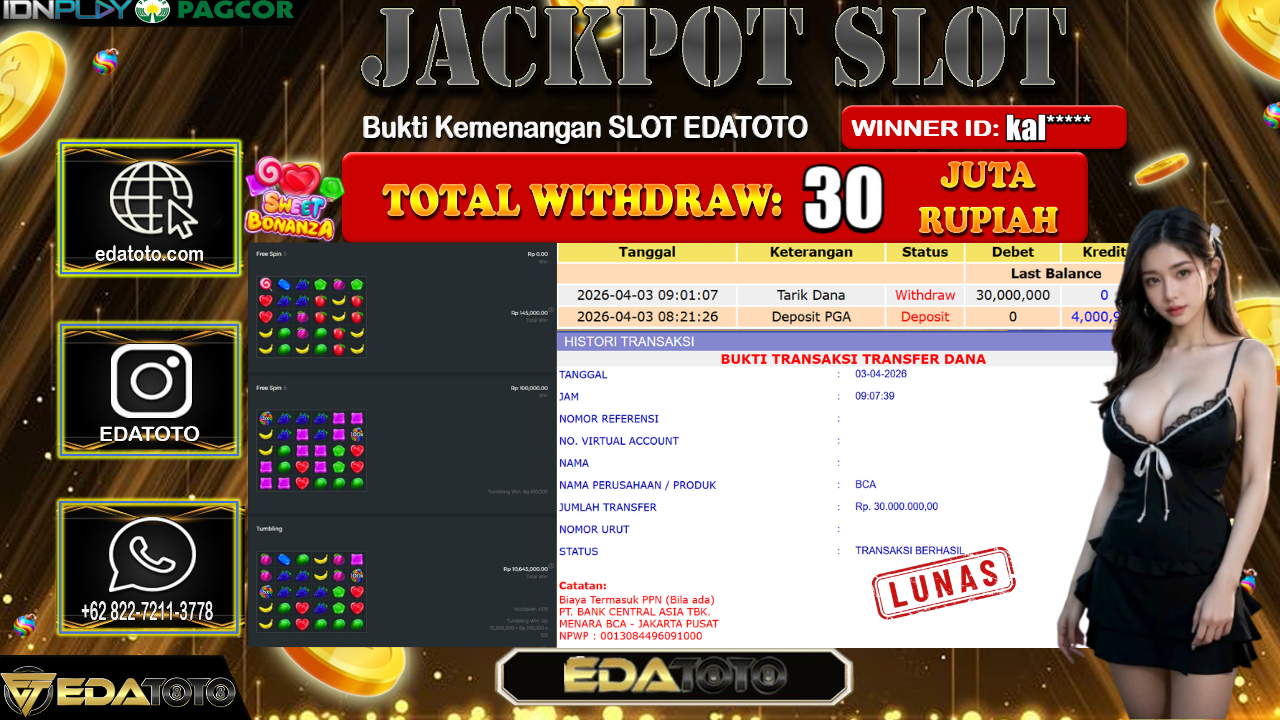 Selamat Kepada Pemilik user ID : Kal***** Hari/Tanggal : Jumat/ 03 APRIL 2026 Jackpot : Rp,  25,710,024 JT Withdraw : . . .