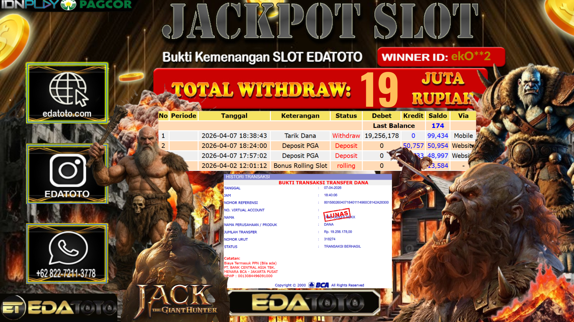 Selamat Kepada Pemilik user ID : ek0**2 Hari/Tanggal : Selasa / 07 APRIL 2026 Jackpot : Rp,  18,462,031JT Withdraw : . . .