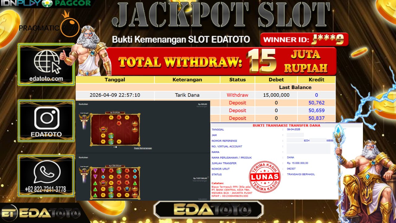Selamat Kepada Pemilik user ID : J***9 Hari/Tanggal : Kamis / 09 April 2026 Jackpot : Rp,  10,121,054 JT Withdraw . . .
