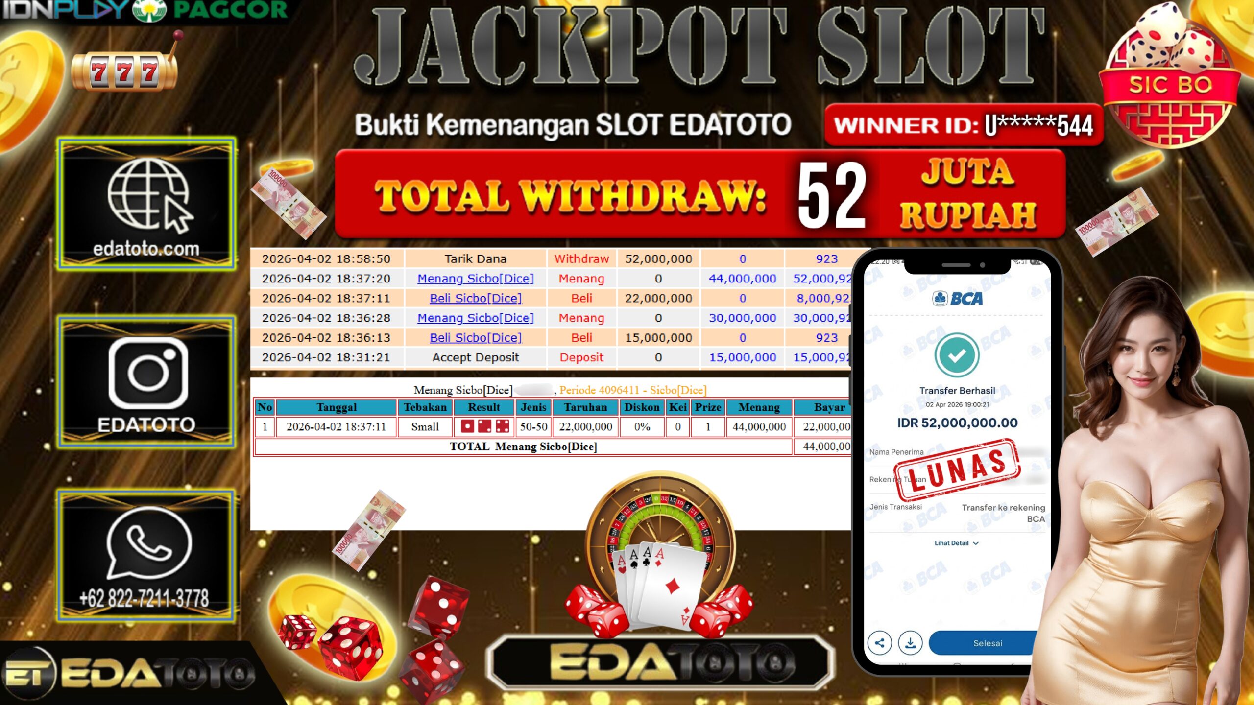Selamat Kepada Pemilik user ID : U*****544 Hari/Tanggal : Kamis / 02 APRIL 2026 Jackpot : Rp,  44,000,000 JT Withdraw . . .