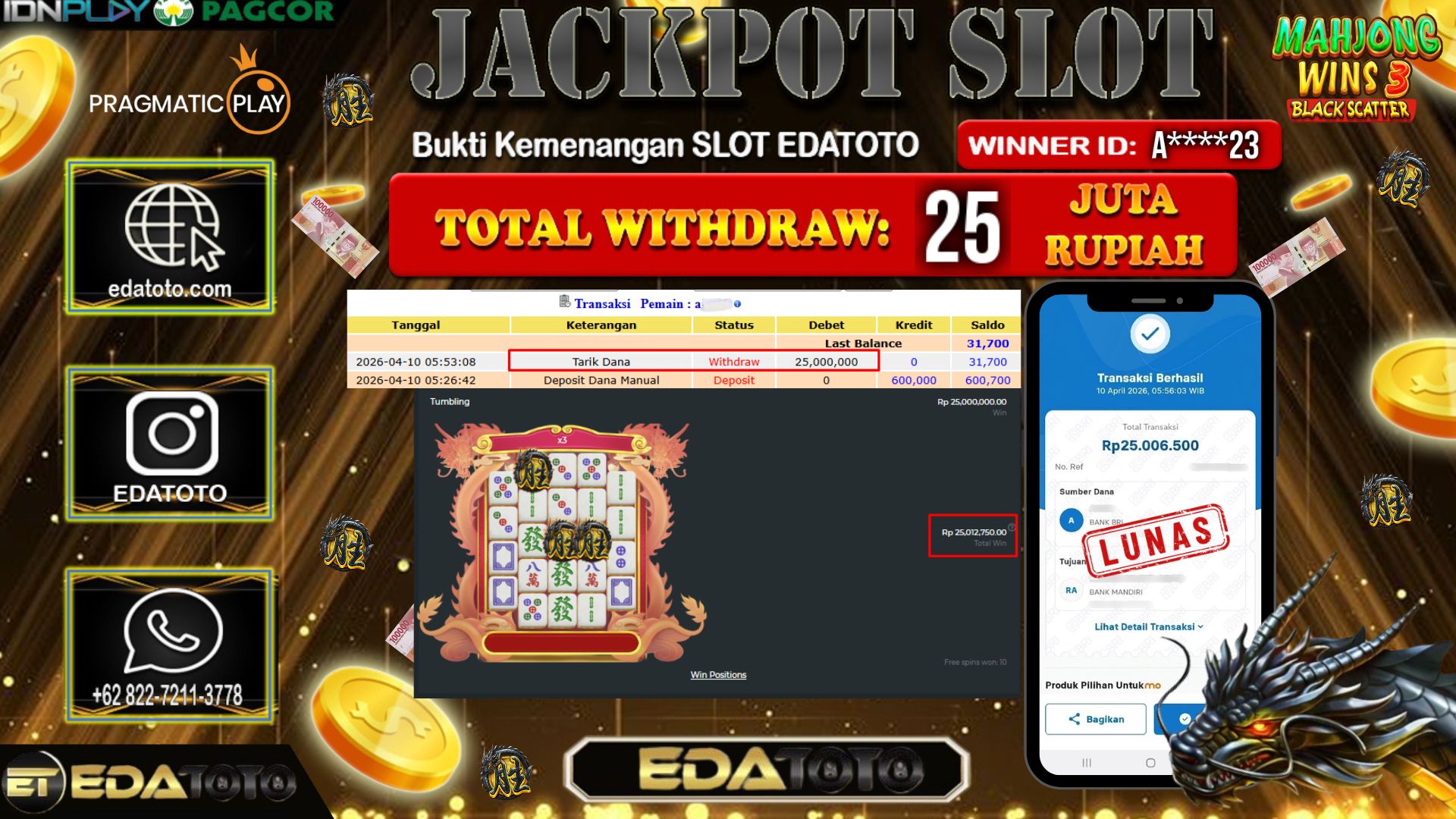 Selamat Kepada Pemilik user ID : A****23 Hari/Tanggal : Jum’at / 10 APRIL 2026 Jackpot : Rp,  25,000.000 JT Withdraw . . .