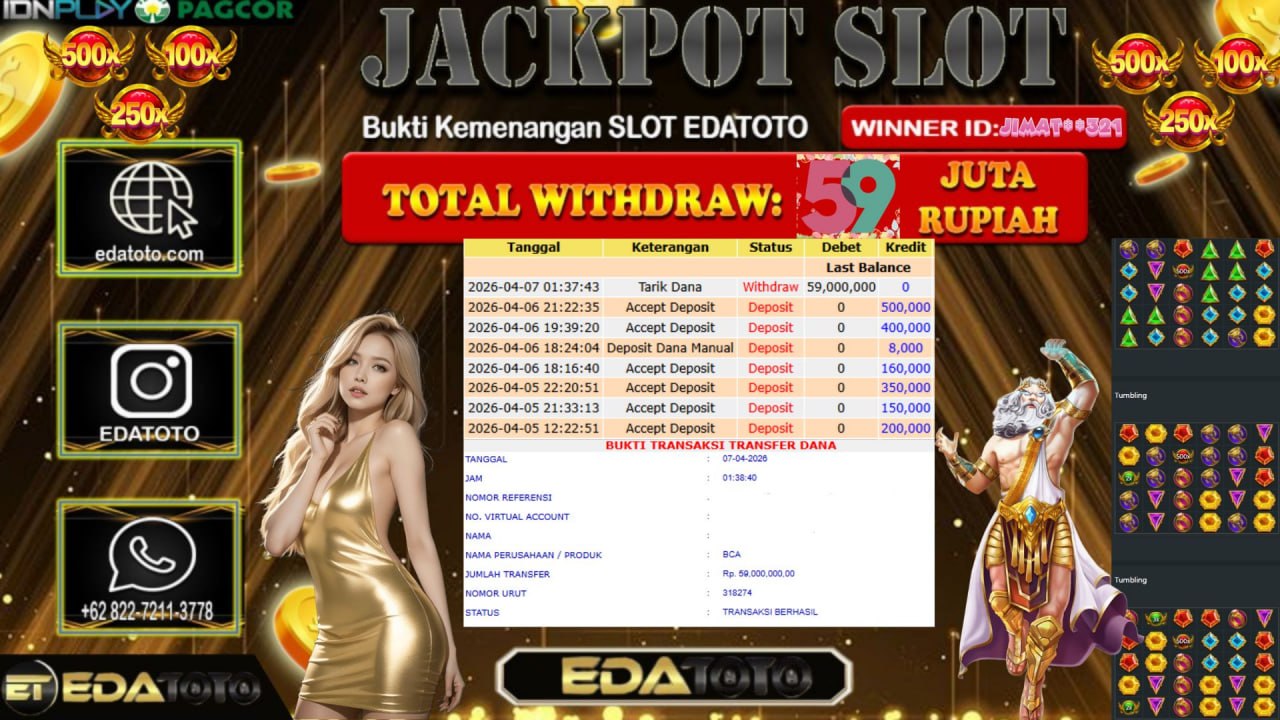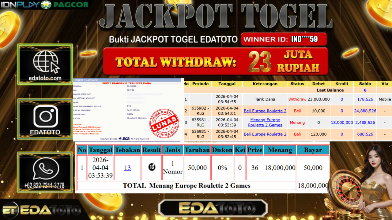 Selamat Kepada Pemilik user ID : IND****59 Hari/Tanggal : Sabtu/ 04 APRIL 2026 Jackpot : Rp,  18,000,000 JT Withdraw : . . .