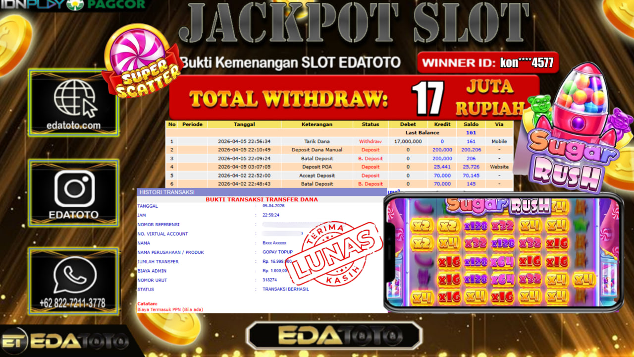 Selamat Kepada Pemilik user ID : kon****4577 Hari/Tanggal : Minggu / 05 APRIL 2026 Jackpot : Rp,  17,000,000JT Withdraw : . . .